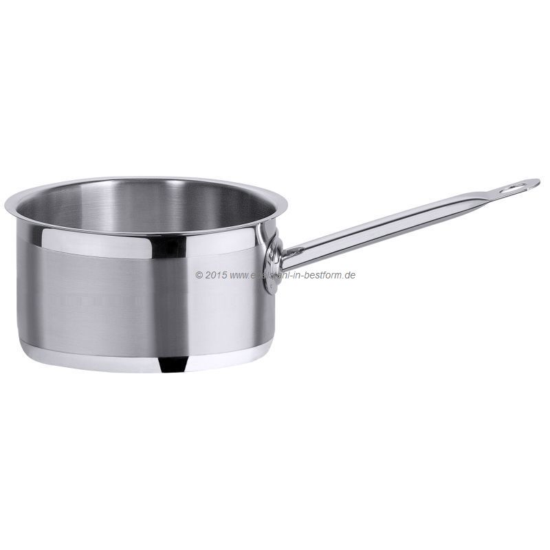 • hohe Form, aus Edelstahl, seidenmatt gebürstet mit hochglänzendem Schüttrand, verkapselter Sandwichboden, induktionsgeeignet, handlicher Hohlstielgriff mit Schutzplatte, extra schwere Qualität