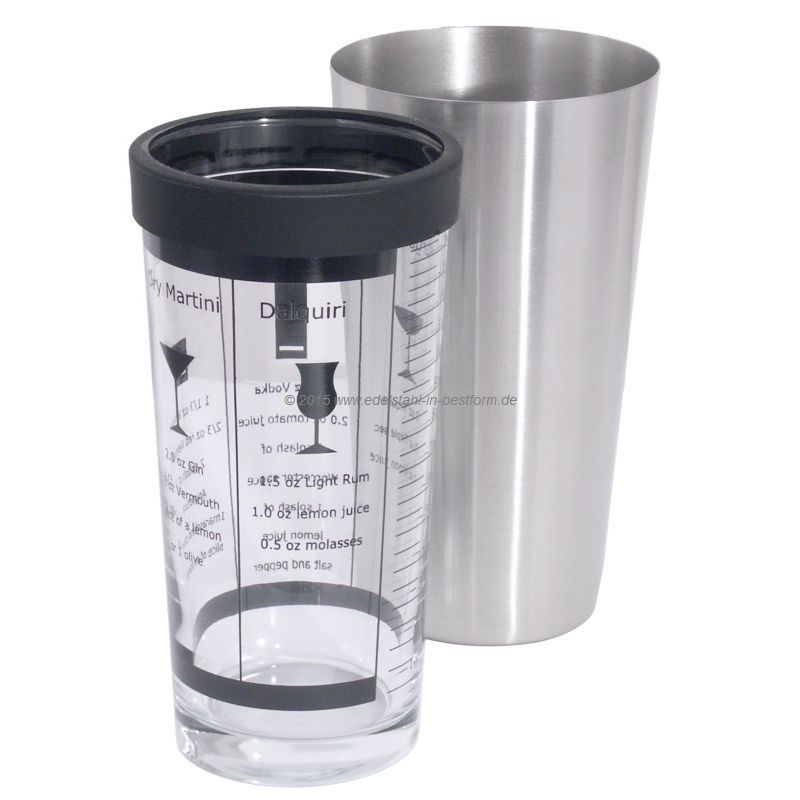 • zweiteilig, aus Edelstahl 18/10, hochglänzend, mit schwarzem Dichtungsring aus Santopren, Becher aus dickwandigem Glas mit Cocktailvorschlägen (englisch) bedruckt