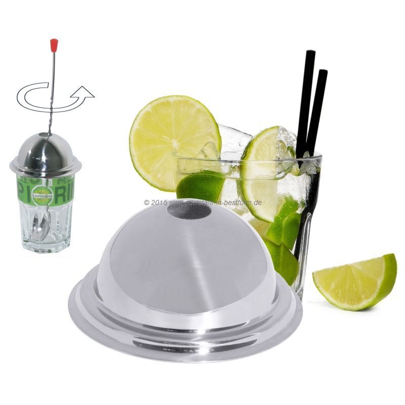 • aus Edelstahl 18/10, daher spülmaschinenfest, hochglänzend poliert, das 'Caipi Cap' wird auf das Glas aufgesetzt und durch die Öffnung kann der Caipirinha oder der Mojito mit einem Löffel gerührt werden, hygienische Alternative zum Auflegen der Hand auf das Glas