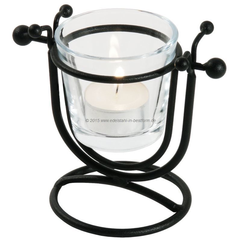 • pendelnde Aufhängung, schwarz beschichteter Stahldraht, Teelicht wird in Glasschale eingesetzt