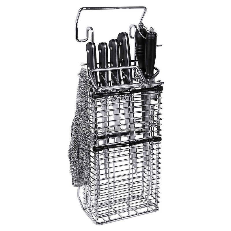 • aus Edelstahldraht 18/10, zum Transport, Aufbewahren und Spülen von vier Kochmessern bis 27 cm Klingenlänge, zwei Wetzstählen und einem Stechschutzhandschuh, mit Klingenschutz, schwere Qualität