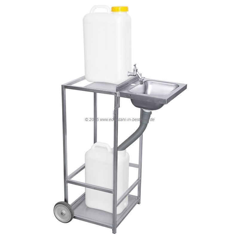 • Rahmen und Waschbecken aus Edelstahl, Becken kann platzsparend um 90° weggeklappt werden, mit je einem Frisch- und Schmutz- wasserbehälter aus stabilem Kunststoff je 19 Liter, Rollen zum leichten Transport, völlig autark: benötigt weder Pumpe noch Wasseranschluss, für Messen, Märkte und Veranstaltungen